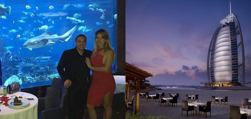O hotel conta com cinco restaurantes temáticos e o primeiro escolhido pelo casal foi o Al Mahara, especializado em frutos do mar, no qual as pessoas jantam cercadas por um enorme aquário. Vale lembrar que os preços altos pagos para usufruir as mordomias de Dubai não é um problema para o cantor, já que só com o Carnaval de Salvador ele levou para o bolso 5 milhoes.