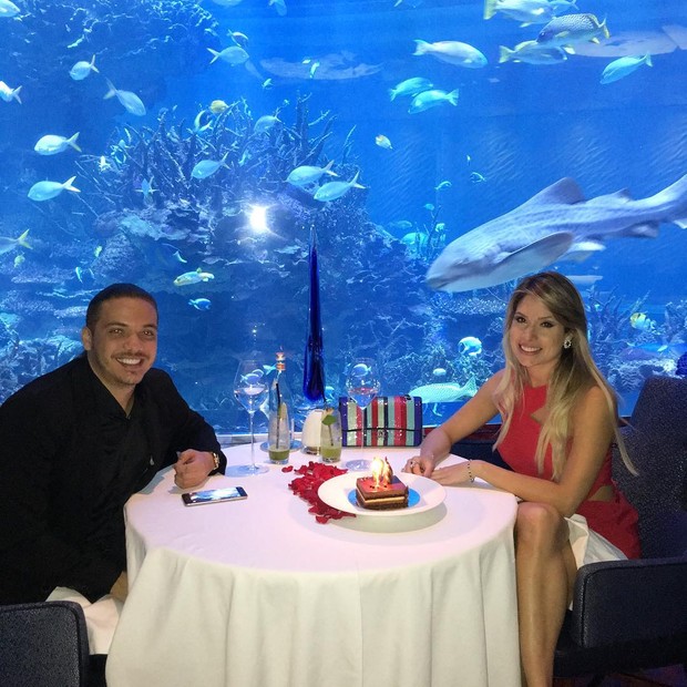 Com muita dedicação e pensando em todos os detalhes para agradar sua amada, o cantor escolheu um local exótico para mais um jantar ao lado de sua esposa Thyane Dantas, um restaurante que possui um aquário com diversas espécies de peixes e tubarões.
